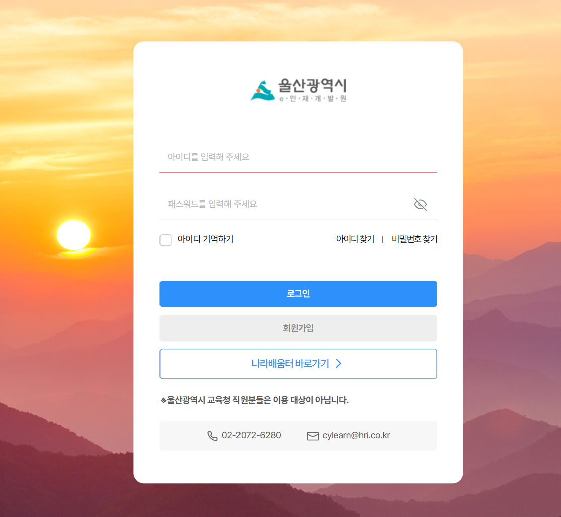 울산광역시 e-인재개발원 사이버연수원은 울산광역시 산하 공무원과 공공기관 임직원들의 교육 접근성을 높이고, 변화하는 행정 환경에 능동적으로 대처할 수 있는 실무 능력을 배양하기 위해 운영되는 통합 온라인 교육 플랫폼입니다.
